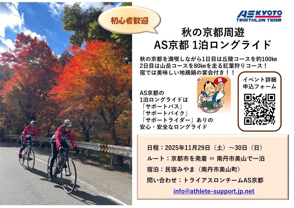 2025年もAS京都の秋恒例の2日間で京都を周遊する1泊ロングライドイベントを開催!エイジ向けのイベントでサポートバスやサポートバイクも付いて、安心・安全なロードバイクでのロングライドを楽しんでいただけます!